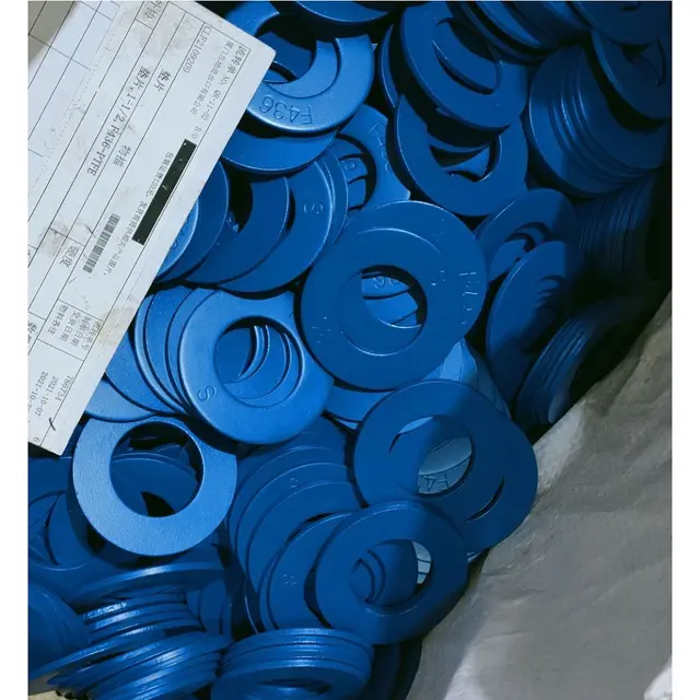 The China Blue Xylan Coated Flat Washer is a high-performance fastener made from ASTM F436 hardened steel, ensuring strength and durability. With a size of 1-1/2 inch (DN40), it features a PTFE-coated surface for enhanced corrosion resistance and reduced friction, making it ideal for use in demanding applications where leak prevention and reliable sealing are crucial.